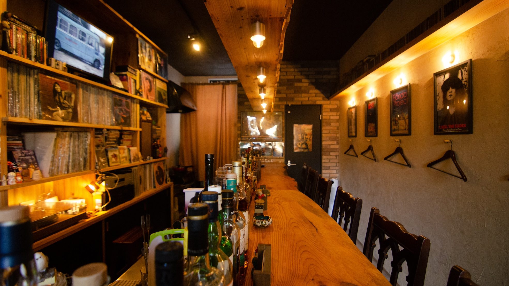 所在 京都市左京区竣工年 2022.6用途 バー施工面積 23.49㎡(7.1坪)種別 木造1階建,内装デザイン施工 アールシステム、DIY他造作協力 SMOLロゴデザイン itouli写真 SMOL